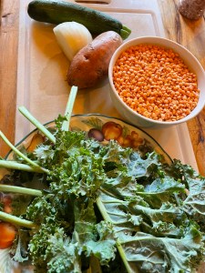 3. Pour in broth, bring to a boil, then reduce to a simmer for 20 minutes, until lentils and sweet potatoes are tender.
