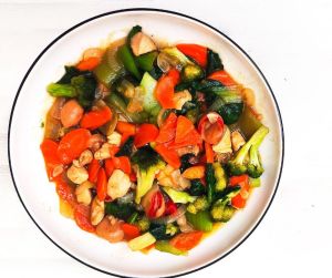 A stir-fry with cabbage, bell peppers, garlic, and ginger works beautifully.