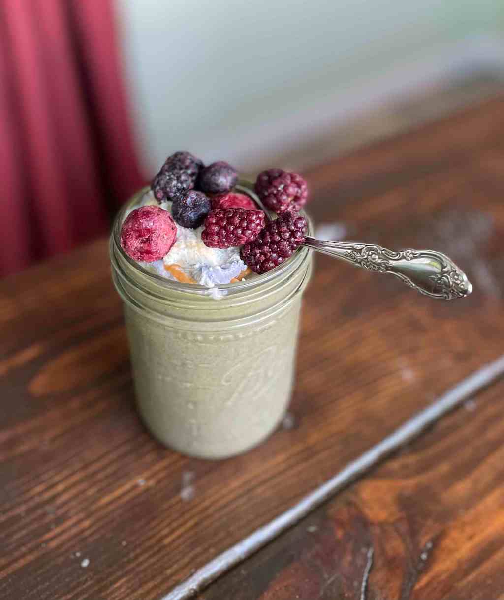 The greens provide magnesium, potassium, folate, and chlorophyll, all of which support mitochondrial energy production and immune regulation. Blending them with fruit makes them easy to eat first thing in the morning, especially if raw greens feel like too much on their own.