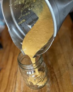 If you want it pourable, add a little more liquid and blend longer. It thickens in the fridge, so I usually add a little apple cider vinegar the next day.